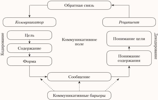 К.С. СтаниславскийКоммуникативная сторона общения включает в себя все, что связано с передачей информации во время общения. В узком смысле общение как коммуникация – это обмен представлениями, идеями, мыслями, интересами, чувствами людей друг с другом в ходе совместной деятельности. Но общение не приравнивается к передаче или обмену информацией. Структура коммуникативной ситуации включает в себя коммуникатора, его сообщение, реципиента, которому оно адресовано, коммуникативное поле, коммуникативные барьеры и обратную связь (рисунок 6). Сообщение, которое передается в процессе коммуникации, меняется, уточняется, развивается, искажается.
