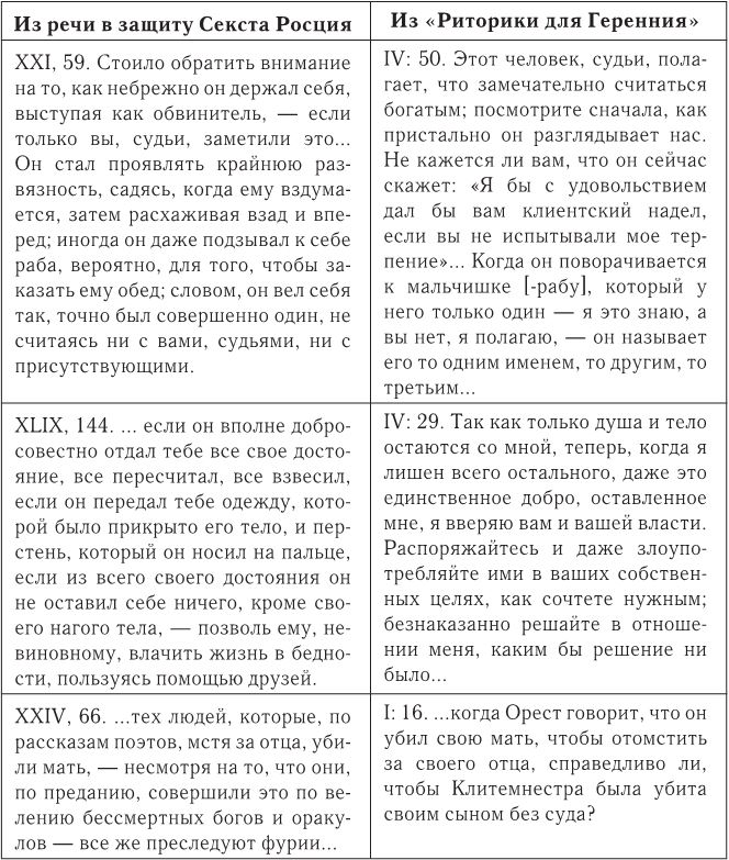 Первые речи Цицерона, которые принесли ему славу оратора – речь в защиту Публия Квинкция (81 г. до н. э.) и особенно речь в защиту Секста Росция (81 г. до н. э.) – произносились в суде. Отметим, что и в «Риторике» главное внимание уделено разработке судебной речи, по мнению автора, наиболее сложной из всех; в примерах, иллюстрирующих построение фигур речи и мысли, значительное место занимают фрагменты речений из судебных тяжб, посвященных имущественным вопросам, т. е. именно тем, которые стали предметом разбирательства на указанных процессах. Ниже приводится несколько фрагментов речей Цицерона и соответствующие выдержки из «Риторики» – их анализ может оказаться полезным для предпринятого нами исследования.