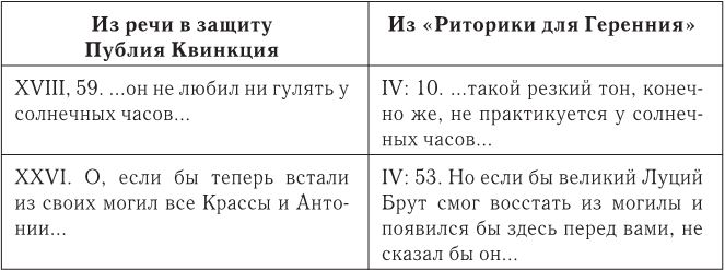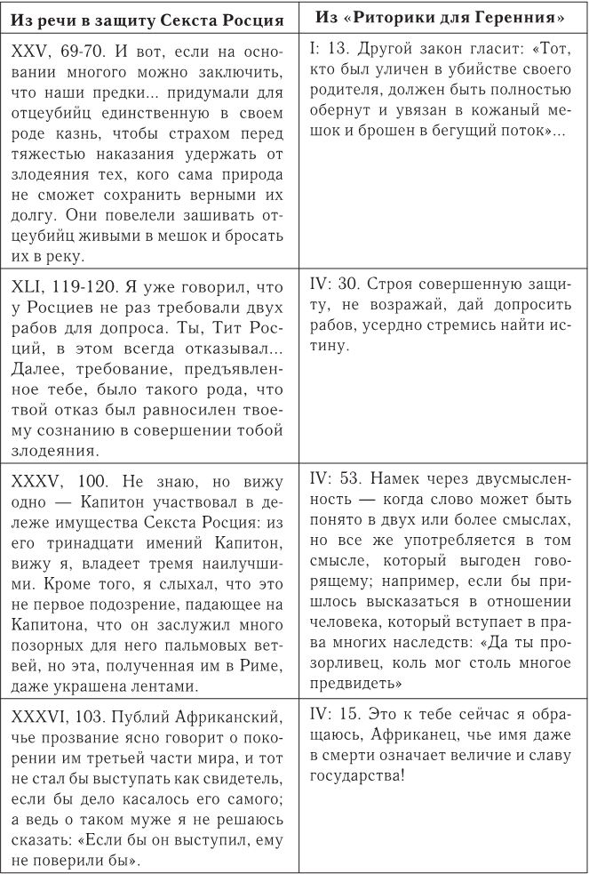 Гораздо уместнее, на наш взгляд, обратиться за подтверждением авторства Цицерона к его ранним речам в попытке найти в них сюжетные, если так можно выразиться, и стилистические совпадения с текстом «Риторики».