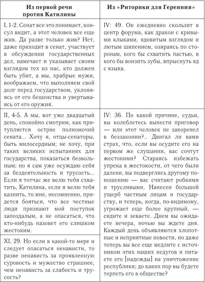 Рассмотрим, например, начало из знаменитой первой речи против Катилины. Здесь тоже немало аллюзий с «Риторикой», самые яркие из которых приведены ниже.