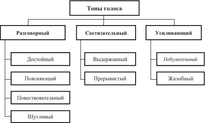 Голосовые качества оцениваются по трем показателям: сила, звучность и гибкость голоса. Первые два полагаются данными человеку от природы и мало зависящими от искусства оратора. Зато гибкость тона голоса имеет множество подразделений, представленных на рис. 2, от овладения которыми и зависит успех ораторской речи.
