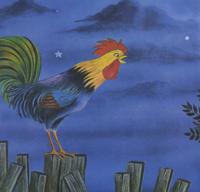 В середине ночи на ферму напала хитрая лиса. Крики куриц разбудили всех вокруг. Фермер спросонья вышел из дома и пошел к клетке. В одной руке он держал фонарь, а в другой палку. Открыв дверку клетки, он вошел внутрь, и увидел, как лиса схватила одну из куриц и убежала. Пока клетка была открыта, испуганный петух выпрыгнул из нее и побежал куда глаза глядят. Он шел так долго, что темная ночь сменилась серым утром. Петух шел по дороге и тихо напевал свою грустную песенку: