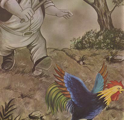 Сын хозяина с ножом в руках подошел к отцу, положил куриц на землю и перерезал каждой горло. При виде смерти своей жены петух сошел с ума и, не совладав с собой, начал громко кричать и биться о клетку. Остальные курицы и их птенцы также начали кричать, и все кругом заполнилось шумом и гамом. Хозяин разозлился и кинул в сторону клетки камень и сказал: «Если не замолчите, я всем прямо сейчас отрежу головы!»
