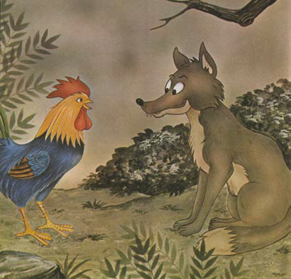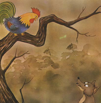 Волк при виде того, что еда убежала, обиделся на лису и ушел. Лиса, трясясь от злости, закричала: «Эй, глупый петух! Быстро спускайся, иначе я сама поднимусь и достану тебя!»