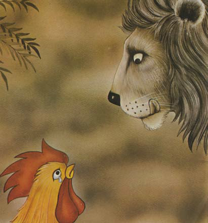 Лев яростно прорычал: «Какой ты болтливый петух! Если хоть еще один раз ты будешь перечить мне, я тебя убью!»