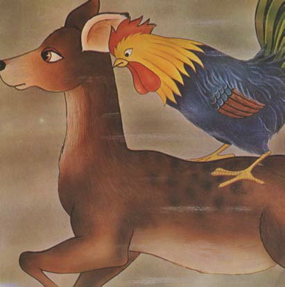 Однажды лев принес раненого оленя, но так как в этот момент он был сыт, оставил его на потом. Грустный петух обработал раны оленя и позаботился о нем. На следующий день, когда лев после сытного обеда лег спать, петух сел на оленя, и они вместе убежали из этого леса. Когда утром лев проснулся и увидел, что их нет, послал всех животных на их поимку. Волк нашел оленя и убил его. Но петух сумел спастись и продолжил свой путь в поисках города счастья. Каждый раз, когда ему становилось грустно, он тихо напевал: