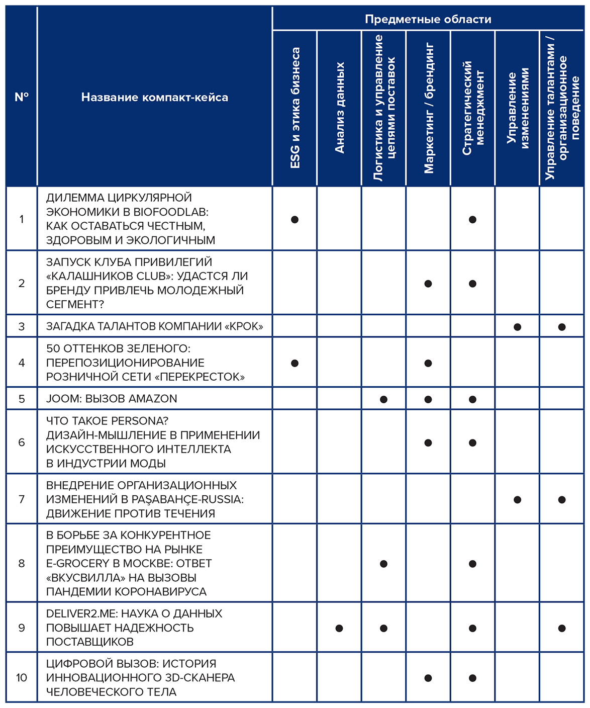 Сборник компакт-кейсов охватывает широкий круг тем, включая предпринимательство, стратегический менеджмент, бизнес-инновации, управление цепями поставок, управление брендами, ESG и этику бизнеса, управление талантами. Кроме того, в ряде кейсов рассматривается такая «горячая» тема, как особенности ведения бизнеса во время пандемии COVID-19.