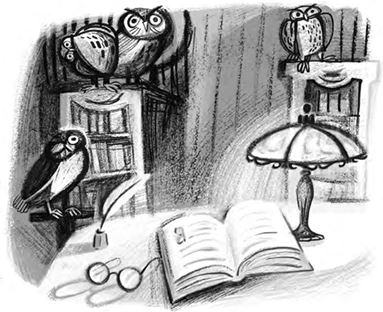 Когда Альве дошёл наконец до двери башни, руки его оказались ободранными, и из них текла кровь, а башмаки его совсем изорвались. Дверь башни была отворена, и принц вошёл в неё. Внутри башни он увидал странное зрелище. Там было великое множество сов. Все они сидели совершенно неподвижно, глубоко задумавшись, каждая на своём месте. Принц начал было считать сов, как вдруг увидал старого человека с длинной седой бородой и совершенно белыми волосами. Старик сидел у стола, на котором были расставлены большие подзорные трубы и разложены карты. Старый учёный заметил принца и сказал: