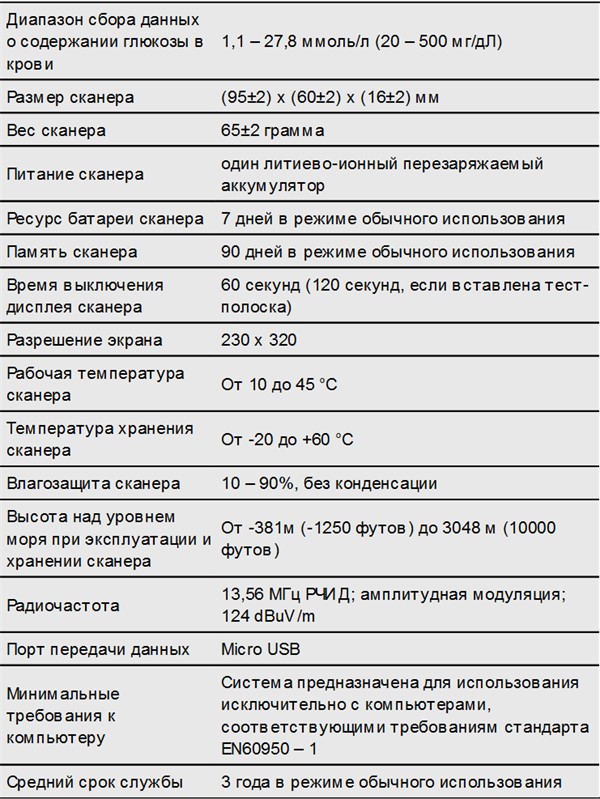 Таблица 1.2. Технические характеристики сканера системы FreeStyle Libre