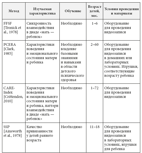 В таблице представлены методы стандартизированного наблюдения, широко используемые в исследованиях и клинической практике. Нестандартизированные методы наблюдения за младенцами и их родителями не рассматриваются в данной главе[1]. Ознакомиться с ними можно в работе, посвященной наблюдению за младенцами и родителями в ежедневных условиях [Closely Observed Infants, 2002].