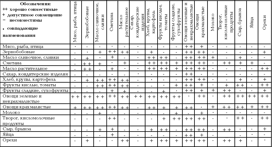 Таблица совместимости продуктов по Г. Шелтону