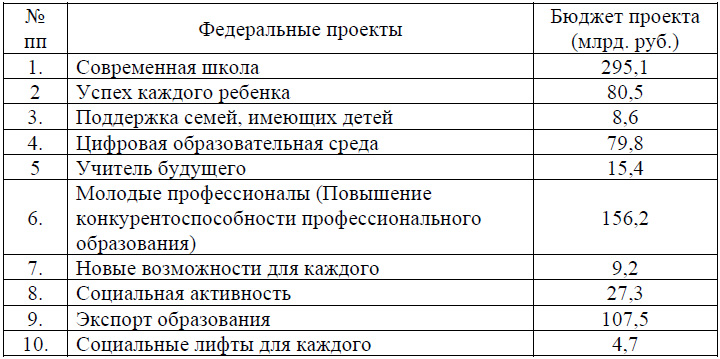 Анализ представленных в Табл. 1–2 данных показывает, что наибольшую долю (41 %) общего бюджета планируется вложить в реализацию Федерального проекта «Современная школа», который направлен на повышение качества общего образования. При этом будут создано 230 тыс. новых учебных мест в образовательных учреждениях страны, из них 24,5 тыс. – в сельских школах и поселках городского типа. В результате этого третья смена в школах будет ликвидирована к концу 2021 года.