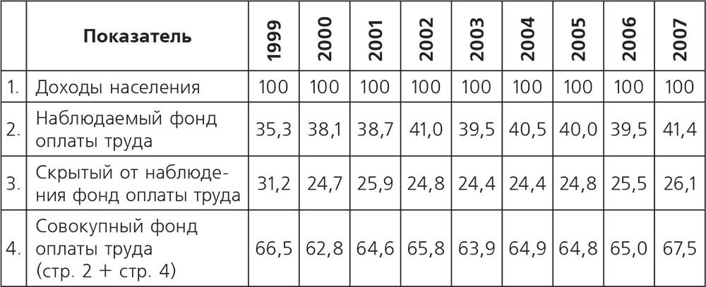 Особенностью российского рынка труда является повышенная гибкость заработной платы при устойчивом уровне занятости[12], что с начала 1990-х гг. способствовало развитию нестандартных форм оплаты труда, выводящих ее за пределы статистического наблюдения. Проводимые начиная с 1999 г. Госкомстатом РФ исследования по количественному измерению скрытой заработной платы позволили получить оценки масштабов данного явления, которые представлены в табл. 1.2.