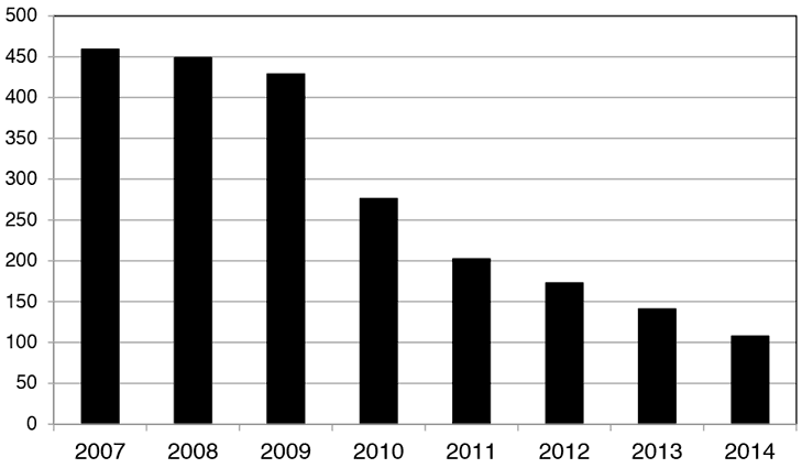 Рис. 1. Динамика общего числа зарегистрированных экономических преступлений в 2007–2014 гг. (см.: Статистика…, 2014)