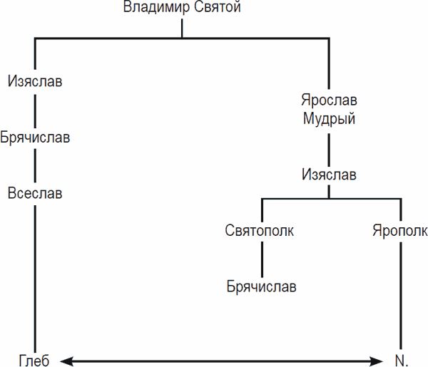 Можно допустить, что, пока речь идет о поколении сыновей Ярослава Мудрого, во внутридинастических браках не так уж часто возникает необходимость – Ярославичи и без того приходятся друг другу родными братьями, и надежды умирить свои раздоры с помощью каких-то дополнительных отношений свойства у них не было. Однако существовала еще полоцкая, обособленная ветвь потомков Владимира Святого. Едва ли можно признать случайностью, что первый, самый ранний внутридинастический брак между двумя представителями рода Рюриковичей заключается между полоцким по происхождению князем Глебом Всеславичем и дочерью Ярополка Изяславича, правнучкой Ярослава Мудрого, и происходит это, видимо, в конце 1080-х годов (рис. 1).