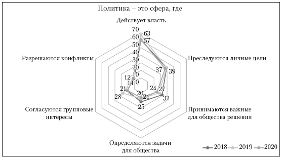 Россияне воспринимают политику как некое «место», ограниченное и закрытое, своего рода «зону власти», где непублично и неформально действуют политики ради реализации личных или узкогрупповых целей; при этом существующий властный порядок не увязывается с порядками правовым и моральным (расхожее определение «политика – грязное дело»).
