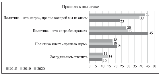 Одна, меньшая, часть опрошенных (до 20 %), представляющая, как было показано ранее, поле политики, полагает, что в политике есть правила. Для большинства же респондентов таких правил нет или они им не известны. Динамика ответов в последние годы позволяет сделать осторожное предположение, что политика (или то, что под ней понимают в России) становится менее публичной и менее предсказуемой: с 2018 г. доля граждан, не знающих правил политики, выросла на 20 п.п. – с 23 до 43 %, а тех, кто говорит об «игре без правил», увеличилась на 16 п.п. и достигла 45 % опрошенных.