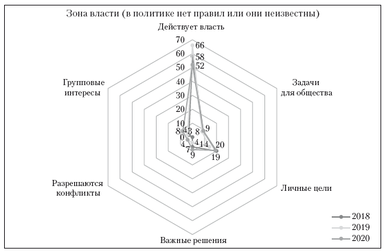 Находящиеся в поле политики более вариативны в оценках ее качеств (см. рис. 4) в отличие от «закрытой» «зоны власти» (см. рис. 5), где непублично и неформально действуют акторы власти ради реализации личных или узкогрупповых целей.