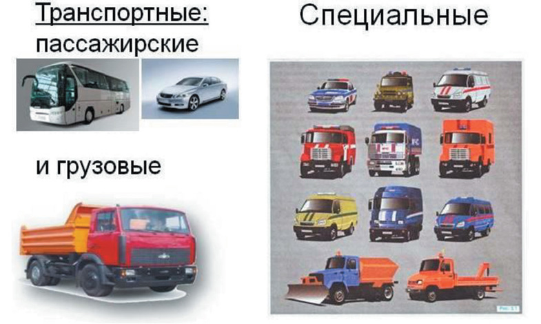 – специального назначения – специальные, которые пред назначены для выполнения специальных работ (автомобили скорой помощи, пожарные машины и т. д.) (рис. 2.1).