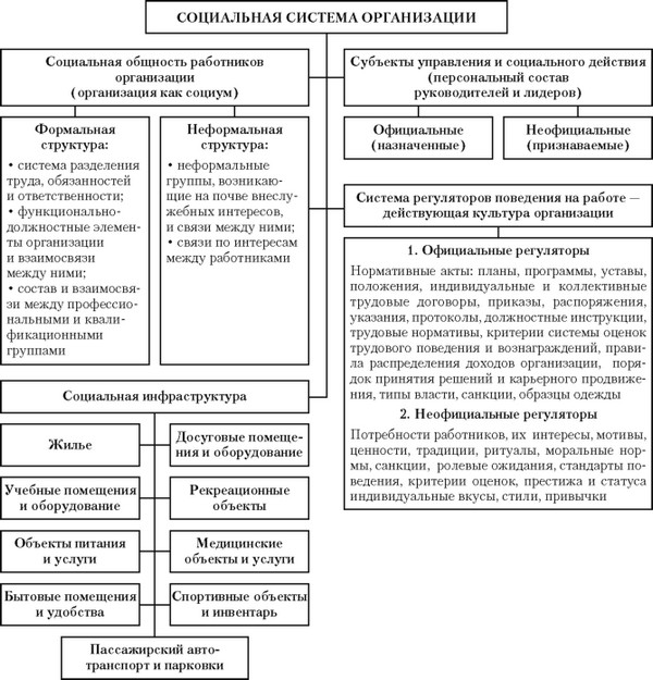 Вторую составляющую социальной системы организации образует ее социальная инфраструктура, или материально-вещественные условия и средства удовлетворения потребностей работников как социальных индивидов и членов их семей. Социальную инфраструктуру организации составляют учреждения, обеспечивающие предоставление работникам и членам их семей определенного набора благ и услуг, служащего удовлетворению их актуальных социальных потребностей (так называемый социальный пакет). В социальную инфраструктуру входят также предназначенные для выполнения соответствующих функций здания, сооружения, помещения, оборудование, приборы, инвентарь и пр. Например, жилой фонд, столовые, буфеты, врачебные кабинеты, поликлиники, детские сады, учебные классы, стенды и тренажеры, комнаты отдыха, дома отдыха и санатории, детские лагеря, библиотеки, музеи, помещения для занятий разными видами искусств и ремеслами: например живописью, музыкой, хореографией и др., стадионы, спортивные площадки, парковки и т. п.