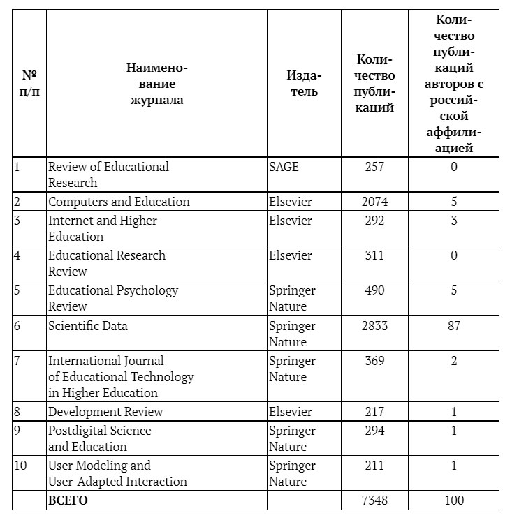 Иллюстрацией текущей ситуации с публикациями российских ученых по наукам в области образования может служить статистика публикаций в ведущих мировых журналах по социальным наукам (Social Sciences – Education). В 10 ведущих международных журналах, отобранных по наукометрическим показателям по указанной тематике за 10 лет (2013–2022 гг.), было опубликовано 7348 статей, проиндексированных в международной наукометрической базе данных (МНБД) Scopus. В том числе за тот же период среди указанных публикаций 100 (1,4 %) имели авторов с аффилиацией российских вузов и исследовательских центров. При этом значительная часть из 100 указанных публикаций – под авторством иностранных ученых, которые имели в том числе российскую аффилиацию, а также 87 из 100 публикаций были опубликованы в журнале открытого доступа (журнал «Scientific Data»). Ниже приводится разбивка публикаций по журналам (см. табл. 1).