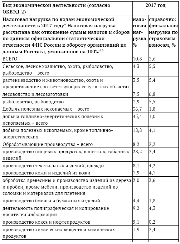 Однако нельзя забывать о влиянии налоговой системы на экономическую жизнь государства в целом и на отдельные сегменты экономики. Это тоже наиболее наглядно демонстрируется в конкретных цифрах налоговой нагрузки на отдельные виды экономической деятельности: