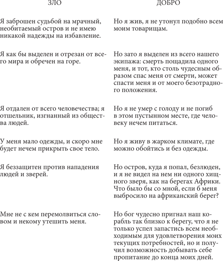 Между тем я принялся серьезно и обстоятельно обсуждать свое положение и начал записывать свои мысли – не для того, чтобы увековечить их в назидание людям, которые окажутся в моем положении (ибо таких людей едва ли нашлось бы много), а просто, чтобы высказать словами все, что меня терзало и мучило, и тем хоть сколько нибудь облегчить свою душу. Но как ни тягостны были мои размышления, рассудок мой начал мало-помалу брать верх над отчаянием. По мере сил я старался утешить себя тем, что могло бы случиться и хуже, и противопоставлял злу добро. С полным беспристрастием я, словно кредитор и должник, записывал все претерпеваемые мной горести, а рядом все, что случилось со мной отрадного.