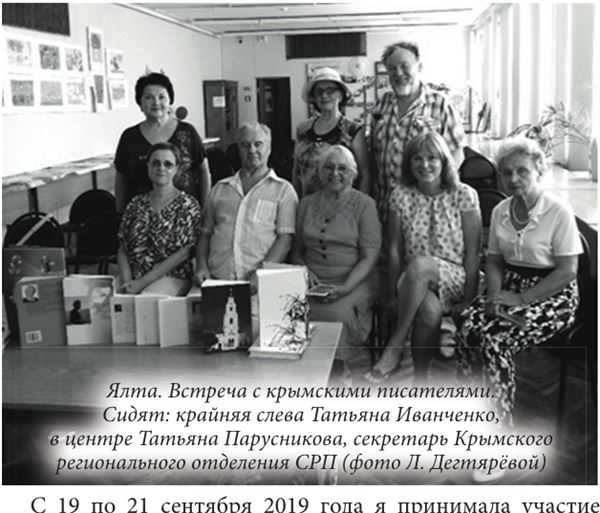 В июне в рамках ежегодного отпуска и заслуженного отдыха мы с председателем Астраханского представительства Союза российских писателей Татьяной Иванченко посетили Ялтинское отделение СРП. В ялтинской библиотеке состоялась творческая встреча, звучали красивые стихи и волшебная музыка. Мы открыли для себя новые имена и, в свою очередь, представили литературную Астрахань: прочли стихи, подарили книги, в том числе и наш литературный журнал «Зелёный луч». Завязалась творческая дружба – настоящая, крепкая.