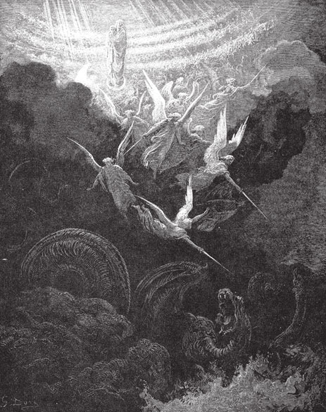 И вот явилось знаменье на небе,И знаменье великое то было:Предстала вдруг жена, и в солнцеОна была облечена, а под ногамиУ ней луна была, и на главе ееВенец сиял из звезд, двенадцать коих было.Жена имела в чреве и кричалаОт болей и от мук рождения. И вотДругое знаменье явилося на небе:Предстал дракон огромный, красный, у негоГолов была седмица и десятокРогов; на головах же былиСедмь диадем; и хвост его увлекЧасть третью звезд небесных и повергнулНа землю их, и тот драконПредстал перед женой, которойРодить уж надлежало, дабы,Когда родит она младенца, то егоПожрать; и родила она младенца,И был он мужеского пола, надлежитПасти ему народы все жезлом железным,И было то дитя восхищено для Бога.Жена ж в пустыню убежала; былоТам место ей назначено от Бога.Без малого четыре года там ееПитали; и в то времяВойна произошла на небе.Архангел Михаил и ангелы егоВеликого дракона и драконовС небес низвергли; и великийДракон жену, которая младенца,Что мужеского пола был, родила,Преследовал, низверженный на землю.И той жене крыла два были даны,Как у орла большого, чтоб летелаОна в пустыню и питалась тамВ теченье времени, времен и полвременья.И древний змей, который называлсяДиаволом, пустил из пастиВослед жены рекой обильной воду,Увлечь ее желая той рекой.Но тут жене земля пришла на помощь,Уста свои разверзла и реку,Что змей пустил из пасти, поглотила.Тогда, вновь на жену дракон, рассвирепев,Пошел, чтоб в брань и с прочимиОт семени ее вступить…