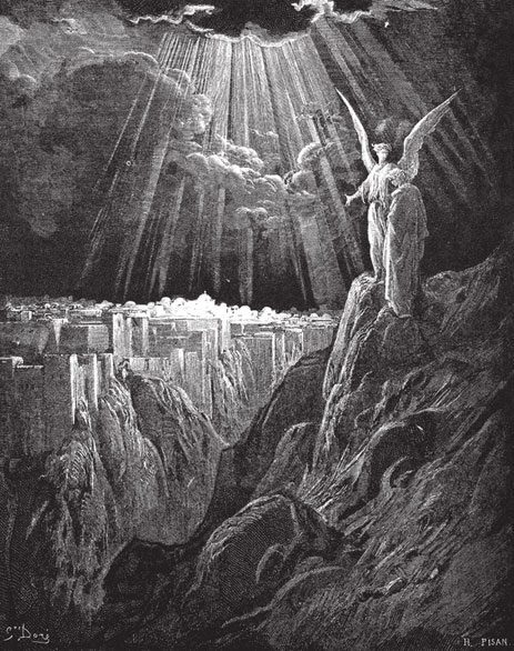 Вот ангел, низошедший с неба,Воскликнул громким голосом пред ним:«Пал Вавилон, великая блудница,И сделался жилищем для бесов,Пристанищем для духов нечестивыхИ всякой птицы отвратительной, нечистой.О горе, горе вновь тебе, великий город,В виссон одетый и в порфиру с багряницей,Украшенный и золотом, и жемчугом,И в камни драгоценные! ПогиблоВедь в час один богатство все твое.И все, кто в море плыл, поодаль сталиИ, видя дым пожара, возопили:«Какой из городов подобен был ему!»И пеплом головы посыпали себе,И плакали, вопили и рыдали.