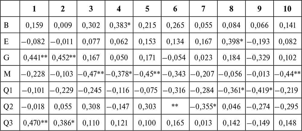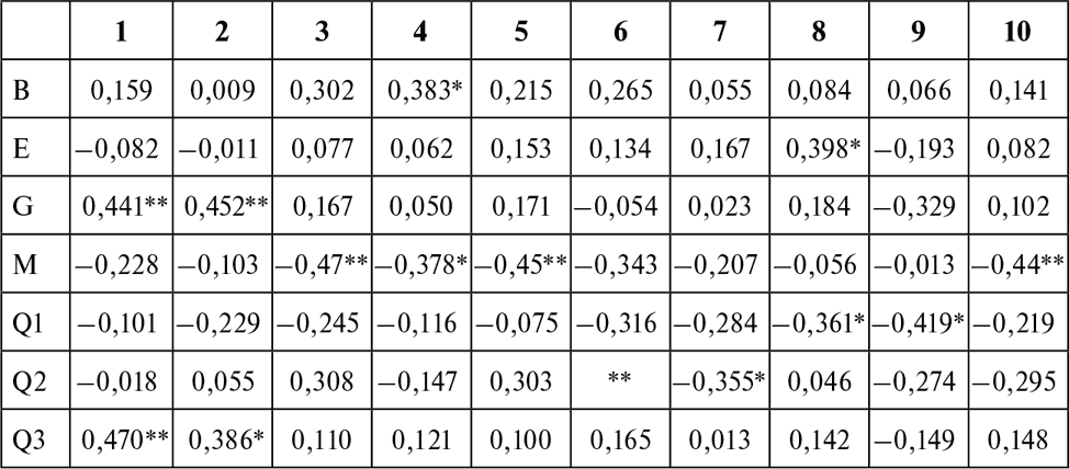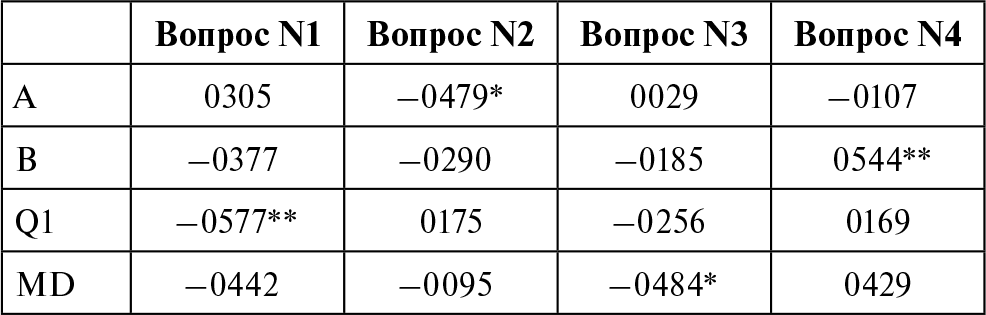 Таблица 2. Коэффициенты корреляции теста 16PF Кеттелла и некоторых вопросов анкеты на ценностную поляризацию сознания