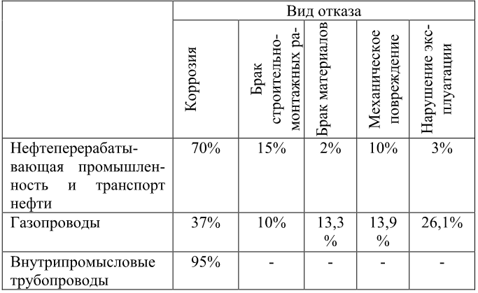 В Российской Федерации ежегодные потери металлов из-за их коррозии составляют до 12 % общей массы металлофонда, что соответствует утрате до 30 % ежегодно производимого металла. В денежном выражении эти потери составляют сотни миллионов рублей. Государство терпит огромные убытки, что отрицательно влияет на экономические показатели. Кроме столь огромных связанных с коррозией прямых потерь, существуют еще большие косвенные потери. К ним относятся расходы, обусловленные потерей мощности металлического оборудования, его вынужденными простоями из-за аварий, а также расходы на ликвидацию последствий аварий, часто носящих характер экологических катастроф. Большие потери от коррозии терпят главные отрасли нашей страны. Так, потери металла от коррозии составляют: в ТЭК – 30 %, химии и нефтехимии – 20 %, сельском хозяйстве – 15 %. Анализ причин отказов и аварий нефтегазовых сооружений показывает о превалирующем влиянии коррозионного фактора (табл. 1). В нефтедобывающей промышленности и транспорте нефти 70 % отказов происходит по причине коррозионных повреждений [2].