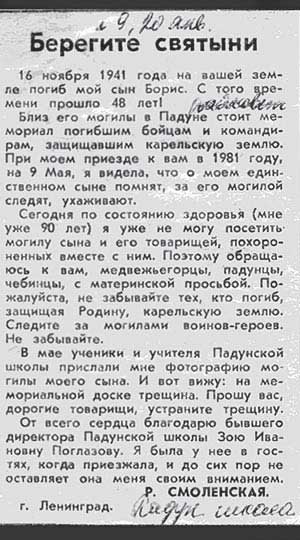 Смоленский Борис Моисеевич, 1921 г. рождения, уроженец города Новохоперска, призванный в С. А. райвоенкоматом г. Москвы, значится погибшим 16 ноября 1941 г. Похоронен: н/п Падун Медвежьегорского района, Карело-Финской ССР.