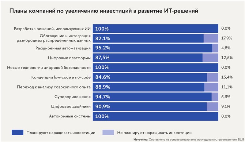 Как показал опрос, российские компании в целом удовлетворены даже текущими результатами от использования ИТ-решений и видят в них значительный потенциал. Для различных ИТ-трендов доля компаний, которые планируют увеличивать объем инвестиций, колеблется в диапазоне от 82 до 100 %, причем максимальный показатель зафиксирован в отношении сразу трех трендов: «Автономные системы», «Новые технологии цифровой безопасности» и «Разработка решений, использующих ИИ».
