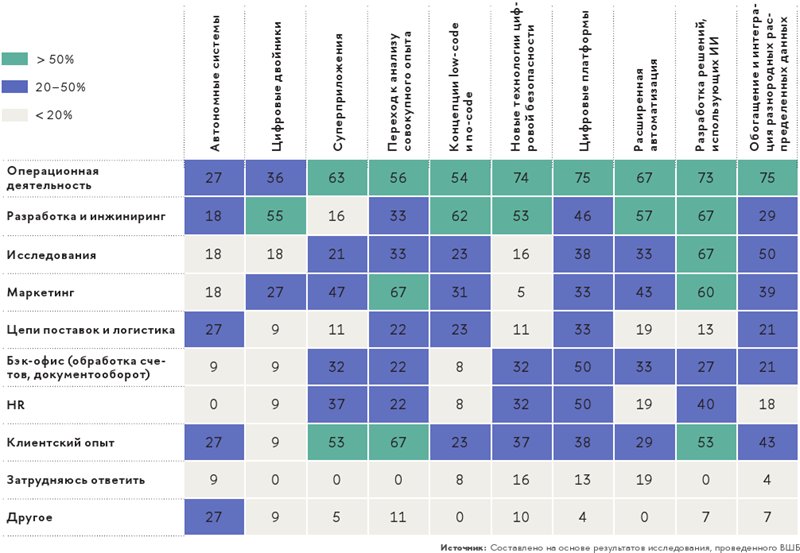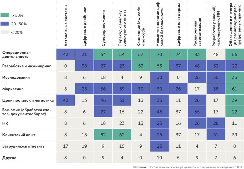 Области текущего и ожидаемого применения ИТ-решений на базе соответствующих трендов (%)