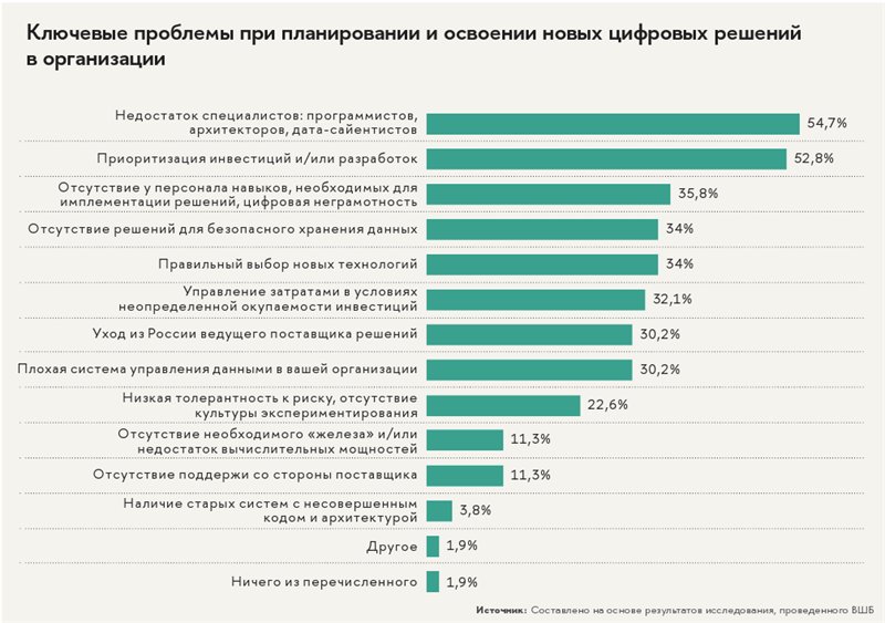 Также в рамках опроса мы выявили наиболее серьезные проблемы, с которыми сталкиваются российские компании при планировании и освоении новых цифровых решений. В первую пятерку вошли недостаток специалистов (программистов, архитекторов, дата-сайентистов); приоритизация инвестиций и/или разработок; отсутствие у персонала навыков, необходимых для имплементации решений, цифровая неграмотность; правильный выбор новых технологий; наличие старых систем с несовершенным кодом и архитектурой.