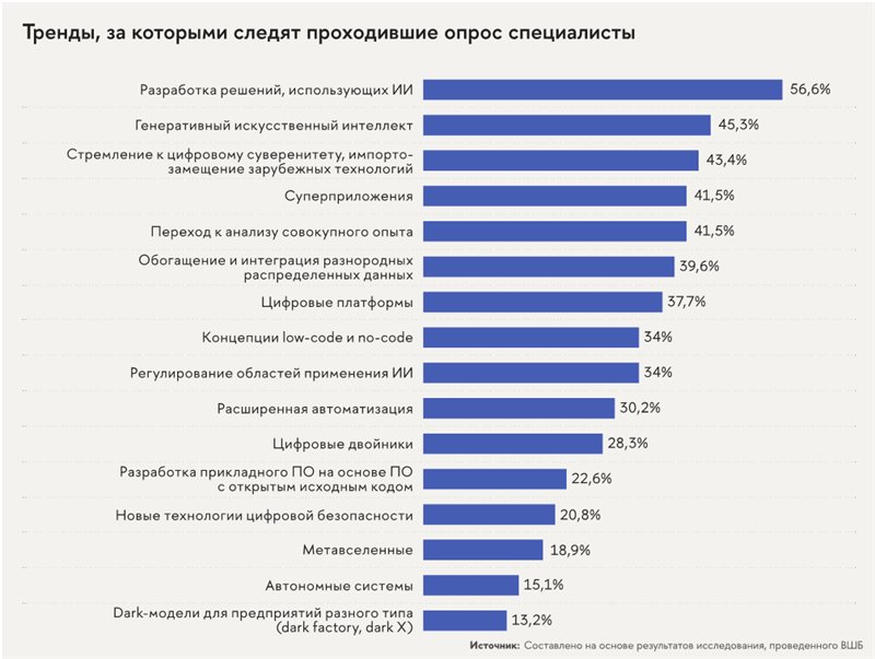 Результаты опроса показали, что сотрудникам наиболее интересны такие ИТ-тренды, как разработка решений, использующих ИИ (56,6 %); суперприложения (41,5 %); обогащение и интеграция разнородных распределенных данных (39,9 %). Также сотрудники заинтересованы в вопросах импортозамещения, достижения цифрового суверенитета, генеративного искусственного интеллекта и в регулировании областей применения ИИ.