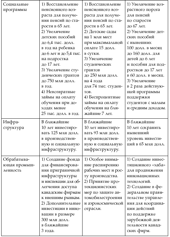 Главным фактором, повлиявшим на решение канадского избирателя, оказалось ожидание перемен. Суть экономической программы консерваторов была предельно проста – ничего принципиально не менять, придерживаться прежнего курса, оказывать всемерную поддержку развитию нефтегазового сектора, сохранять сравнительно низкие налоги, не вводя новых, пугая при этом избирателей планами Либеральной партии и НДП лишить бизнес налоговых льгот и увеличить пенсионные и иные страховые отчисления.