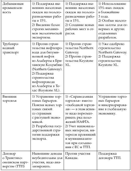 Различались позиции партий и по отдельным направлениям политики и ключевым проблемам. Так, в сфере энергетической и экологической безопасности консерваторы продолжали настаивать на необходимости реализации многомиллиардных проектов строительства новых нефтепроводов для транспортировки нефти из провинции Альберта на мировой рынок, одновременно обещая сократить выбросы парниковых газов в стране к 2030 г. на 30 % (от уровня 2005 г.) и инвестировать в «зеленую» энергетику и энергосберегающие технологии.