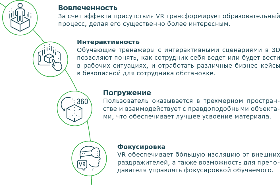 • беспрецедентный уровень погружения обеспечивает быстрое усвоение материала и нейтрализует внешние отвлекающие факторы;