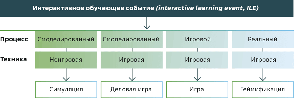 Интерактивное обучающее событие (interactive learning event, ILE) – создает искусственное пространство для обучения, закрепления и практики навыков в безопасной среде. Вовлекает учащегося в интерактивное взаимодействие (с другими участниками или с контентом).