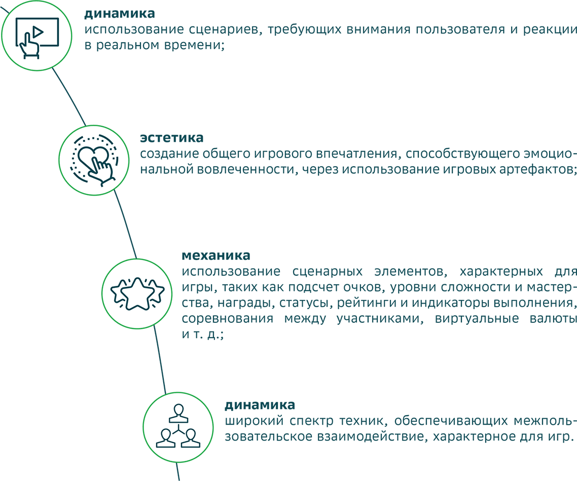 Геймификация (gamification) – это подход, подразумевающий внедрение элементов игры в неигровые процессы реального мира (как онлайн, так и офлайн), в том числе в обучение, с целью повышения вовлеченности обучающихся в решение задач и усвоение материала[19].