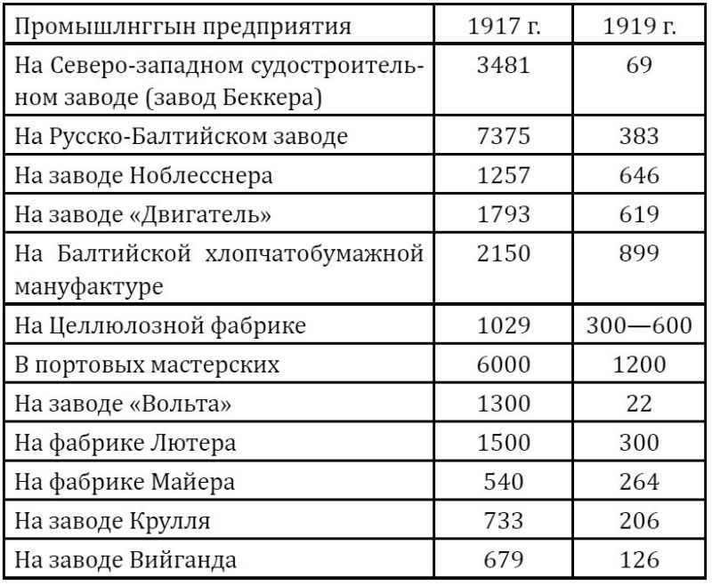 Наиболее сильно эта катастрофа поразила крупные предприятия и именно те отрасли промышленности, рабочие которых всегда играли ведущую и решающую роль в классовой борьбе трудящихся Эстонии. Количество металлистов сократилось на 90,1 проц., деревообделочников – на 71,4 проц., текстильщиков хлопчатобумажной промышленности – на 70,8 проц., шерстяной, льняной и конопляной промышленности – на 42–43 проц., рабочих бумажной промышленности – на 63,9 проц.
