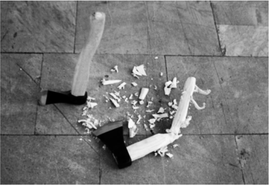 Иллюстрацией может послужить инсталляция Тора Берресена «Убийство топором» (2011).21 В ней весьма наглядно продемонстрировано, что получается, если мы одним инструментом постигаем другой, и какая картина предстанет в итоге перед нами. «Познанное» средство теряет не только эффективность воздействия, но саму способность воздействовать.