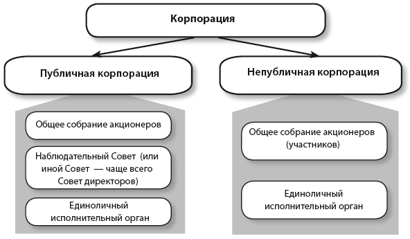В зависимости от того, является корпорация публичной или непубличной, структура органов управления может быть двух или трехзвенной: