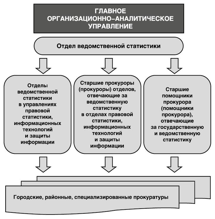 Организационно система ведомственной статистики органов прокуратуры имеет иерархическую структуру, на вершине которой находится Главное организационно-аналитическое управление Генеральной прокуратуры Российской Федерации (далее – ГОАУ)[13], состоящее из Аппарата Генерального прокурора Российской Федерации, организационного управления и информационно-аналитического управления (частью которого является отдел ведомственной статистики).