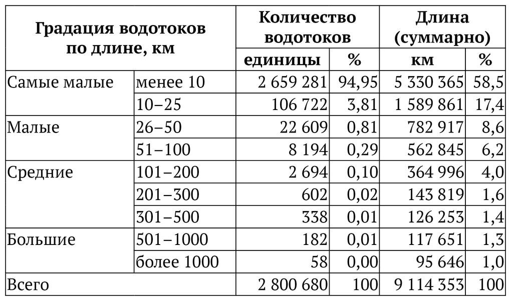 Общее число и протяженность водотоков на территории Европейской и Азиатской частей бывшего Советского Союза[30]