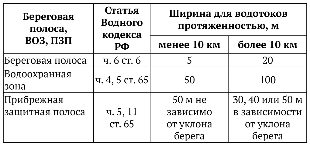 Ширина береговой полосы, ВОЗ и ПЗП самых малых водотоков