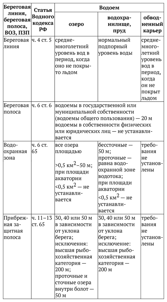 Достоверное определение типа водоема имеет принципиальное значение для застройщиков, т. к. береговая линия проточного озера определяется, как и для реки, по среднемноголетнему уровню вод в период, когда они не покрыты льдом, а для пруда – по нормальному подпорному уровню. Второе отличие заключается в том, что ВОЗ пруда равна ВОЗ водотока, на котором он создан, в то время как для проточного озера площадью более 0,5 км2 она будет составлять 50 м не зависимо от ширины ВОЗ водотока. При площади акватории менее 0,5 км2 ни для пруда, ни для озера ВОЗ не устанавливается (табл. 3).