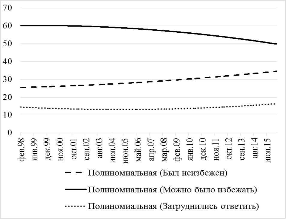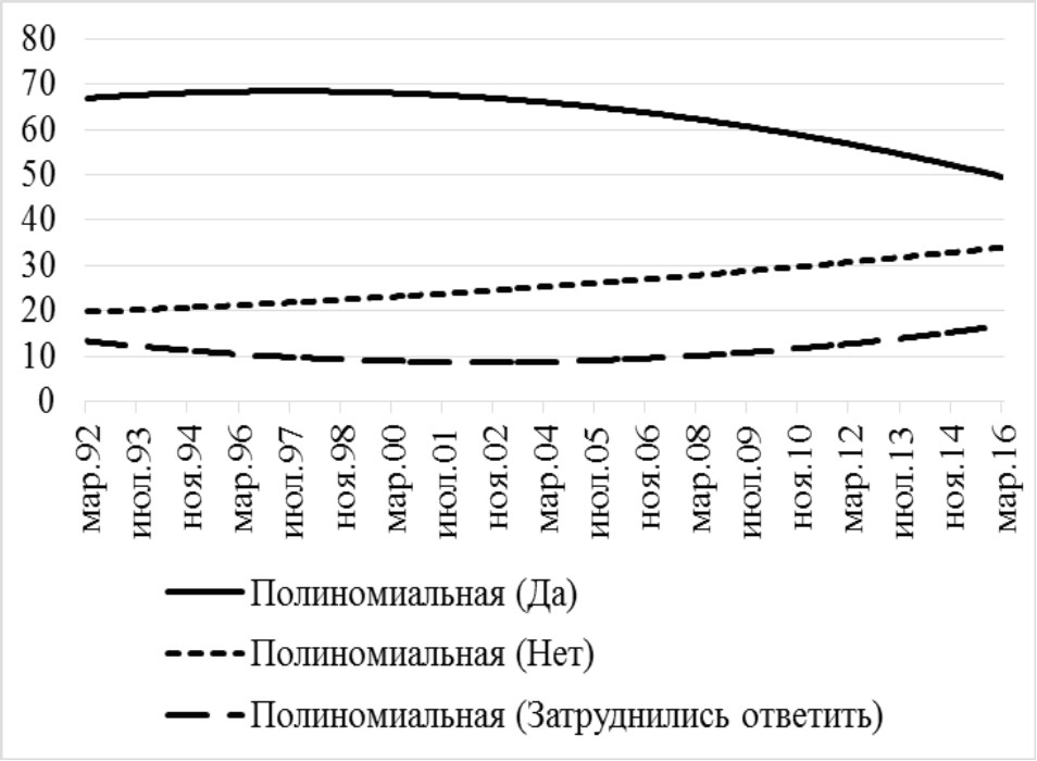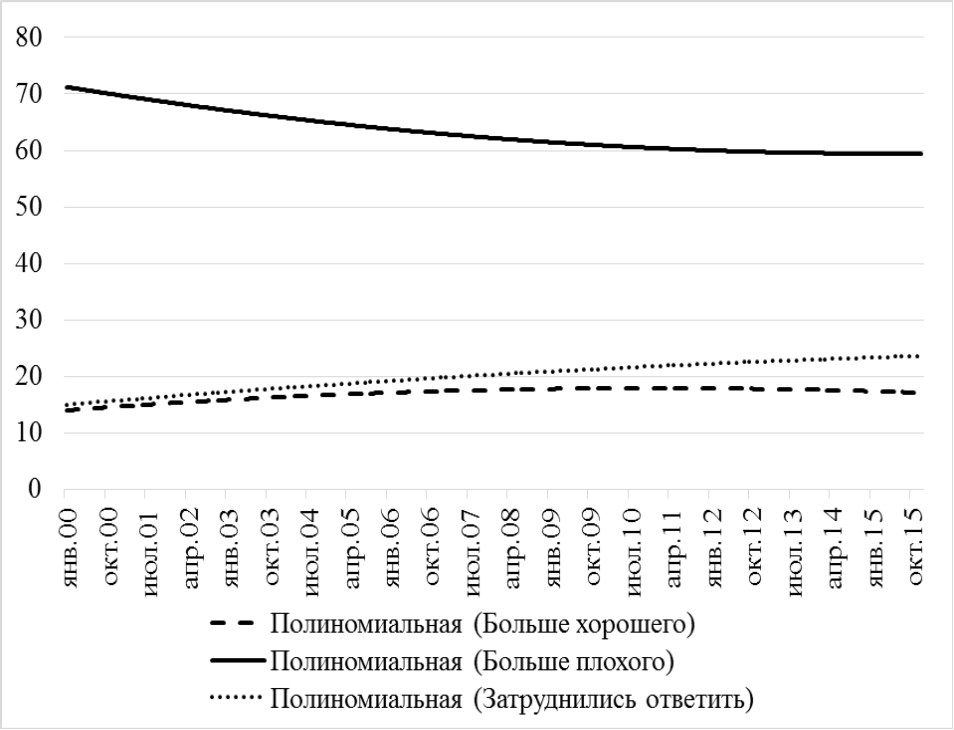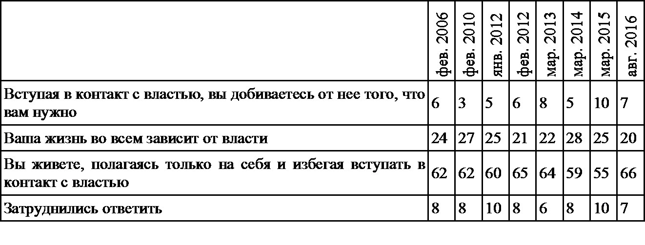 Согласно летнему опросу 2016 г., 64% россиян совершенно не чувствовали ответственности за происходящее в стране (в ноябре 2015 г. таковых было на 9% меньше) [Ответственность и влияние, 2016]. При этом 78% респондентов не надеются на помощь государства и рассчитывают лишь на собственные силы [Готовность участвовать в политике, 2016].